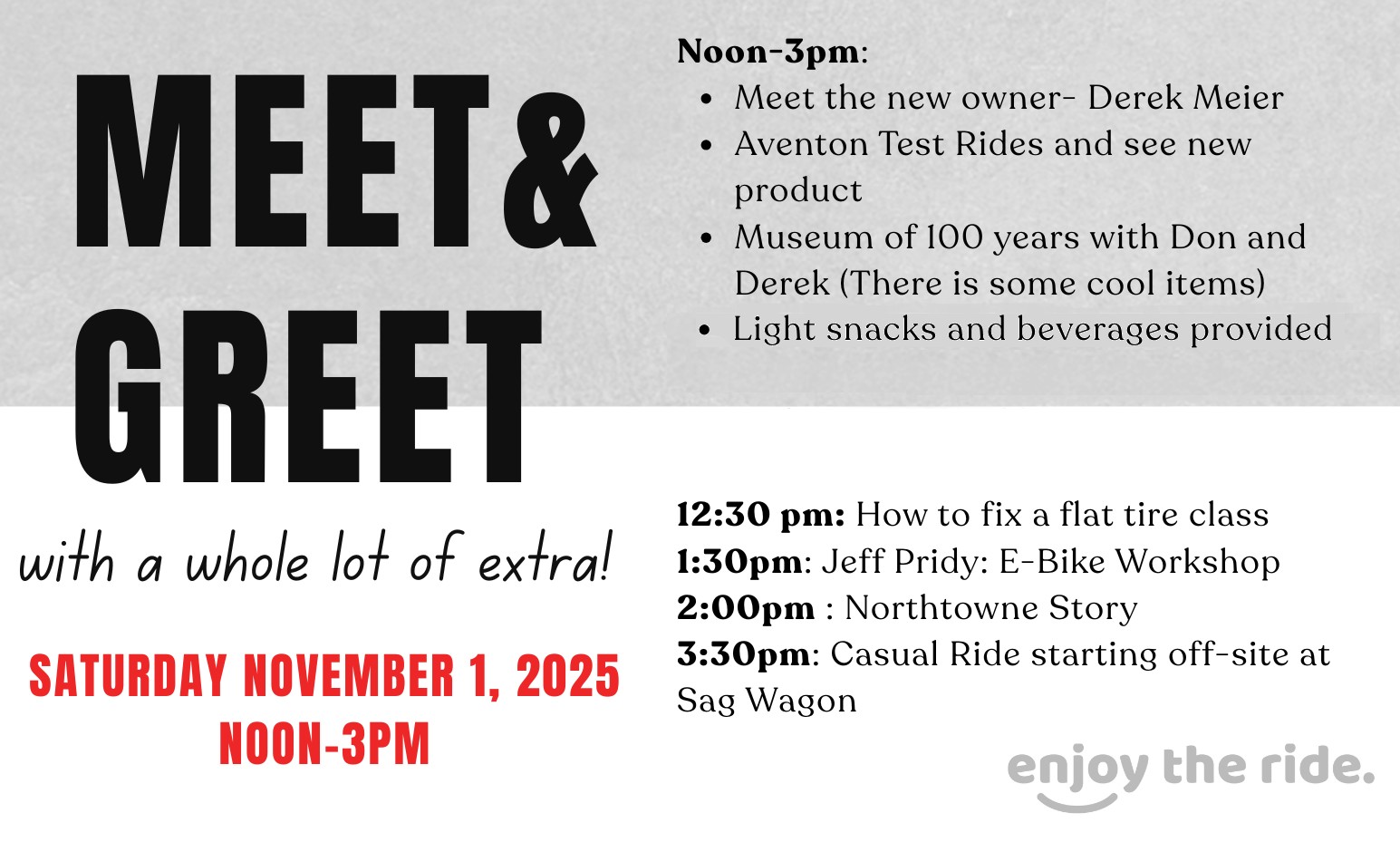 Come meet our new owner, Derek Meier, who is excited to continue Northtowne's 100-year legacy of community and family. Get hands-on training, test-ride the newest Aventon e-bikes, and connect with your fellow cyclists. We will top off the day with a group bike ride starting at Sag Wagon!